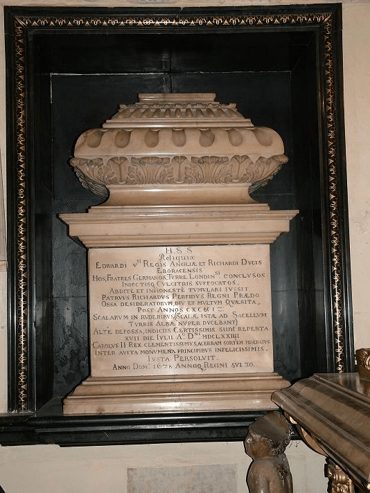 Here lie the relics of Edward V, King of England, and Richard, Duke of York. These brothers being confined in the Tower of London, and there stifled with pillows, were privately and meanly buried, by the order of their perfidious uncle Richard the Usurper; their bones, long enquired after and wished for, after 191 years in the rubbish of the stairs (those lately leading to the Chapel of the White Tower) were on the 17th day of July AD 1674 by undoubted proofs discovered, being buried deep in that place. Charles II, a most compassionate king, pitying their severe fate, ordered these unhappy princes to be laid amongst the monuments of their predecessors, AD 1678, in the 30th year of his reign.